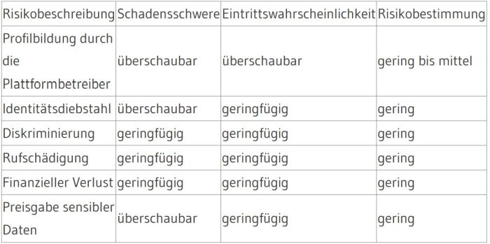 Die eigenen Angebote lösen das in Artikel 35 DS-GVO beschriebene Risiko aufgrund des nur sehr geringen Umfangs einer eigenen Datenverarbeitung selbst nicht aus. Dies gilt insbesondere im Hinblick darauf, dass es sich bei den eigenen Beiträgen hauptsächlich um ein reines Senden von Inhalten ohne Personenbezug handelt, und bei einer etwaigen Kommunikation mit anderen Nutzerinnen und Nutzern (im folgenden „Nutzer“) nur die Daten verarbeitet werden, die diese selbst und freiwillig angegeben haben. Die Nutzung Sozialer Netzwerke durch solche Angebote hat jedoch Auswirkungen, insbesondere hinsichtlich der Auswertung der Daten durch den jeweiligen Plattformbetreiber zu Werbezwecken. Dies stellt eine Verarbeitung mit einem Risiko dar, für die eine Datenschutzfolgenabschätzung vorzunehmen ist.